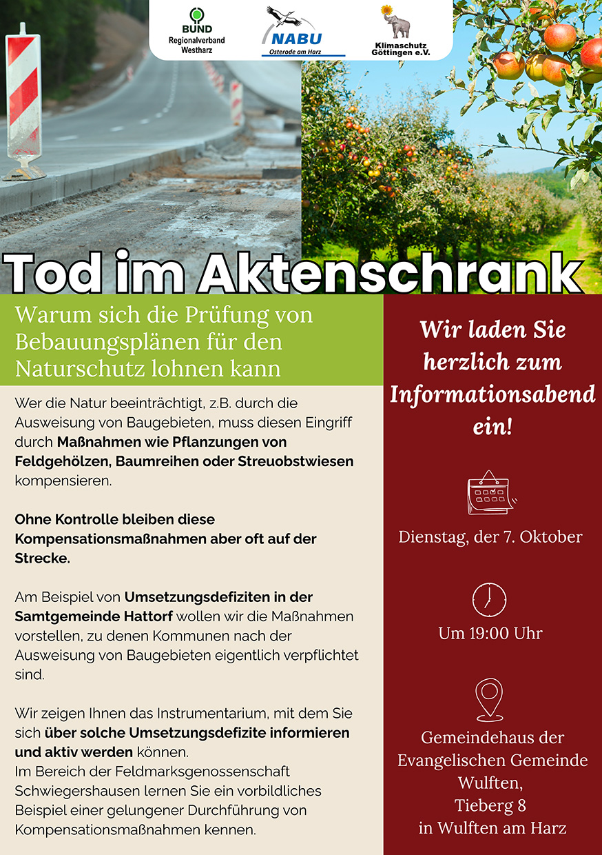 Am 7. Oktober 2025 lädt der Verein Klimaschutz Göttingen gemeinsam mit dem NABU Osterode und dem BUND Westharz zur Veranstaltung „Tod im Aktenschrank – warum sich die Prüfung von Bebauungsplänen für den Naturschutz lohnen kann“ ein.