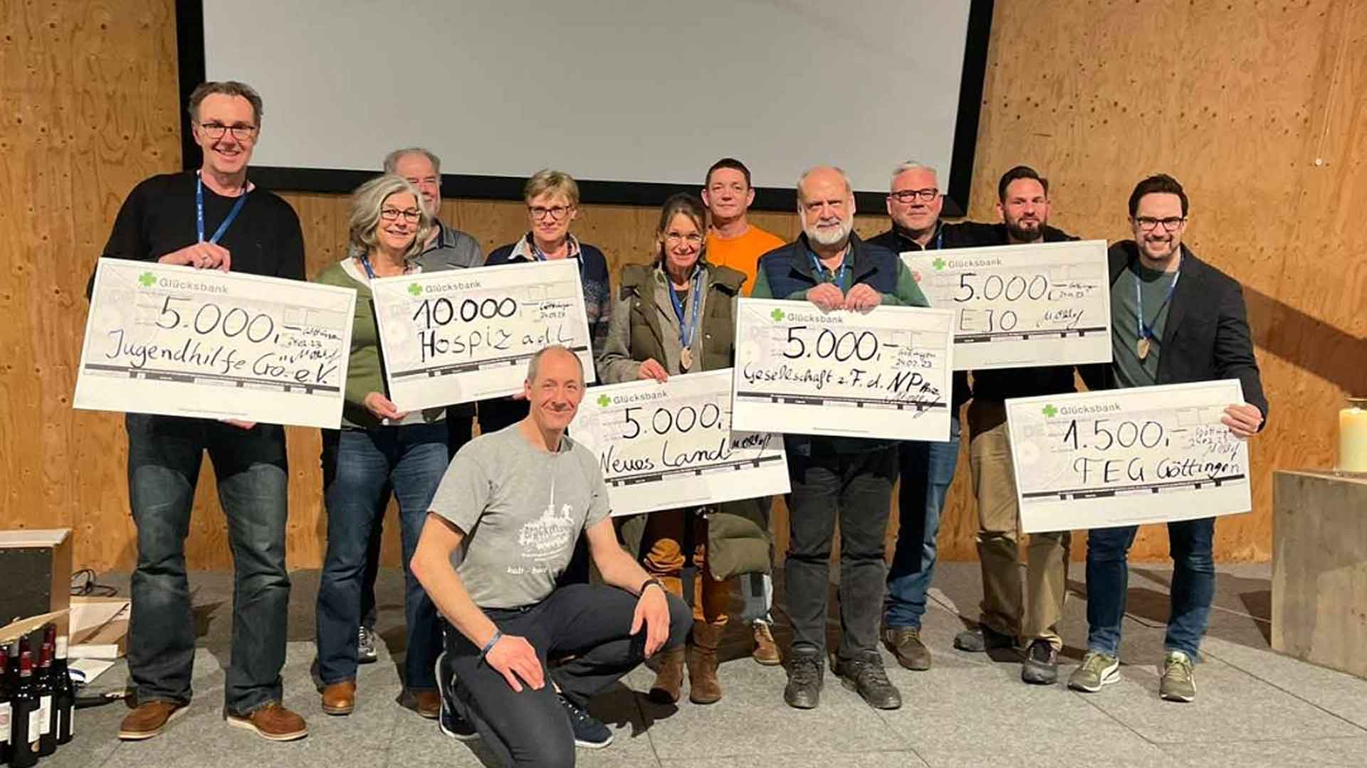 Scheckübergabe 2023 an die Spendenempfänger, darunter Dr. Friedhart Knolle vom Nationalpark-Förderverein GFN e.V. (4. von rechts) in Göttingen., Foto: ASFM/Brocken-Challenge - Titel