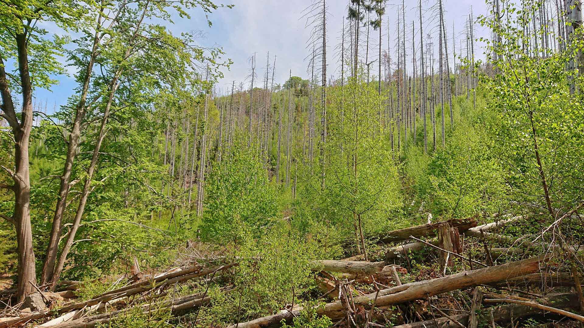 Foto: Neuer Nationalparkwald – die Rückkehr der Laubwälder unter toten Altfichten. Aufnahme Danilo Hartung.