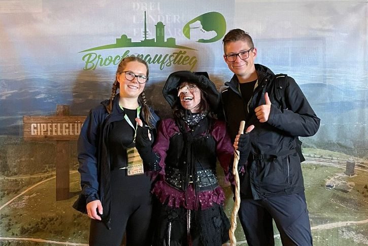Bildbeschreibung: Teilnehmer 2024 beim Wandersportevent Brockenaufstieg 15.6.24 beim Brockenwirt mit Brockenhexe. Bildrechte: Brockenaufstieg Nicolai Fleischer.
