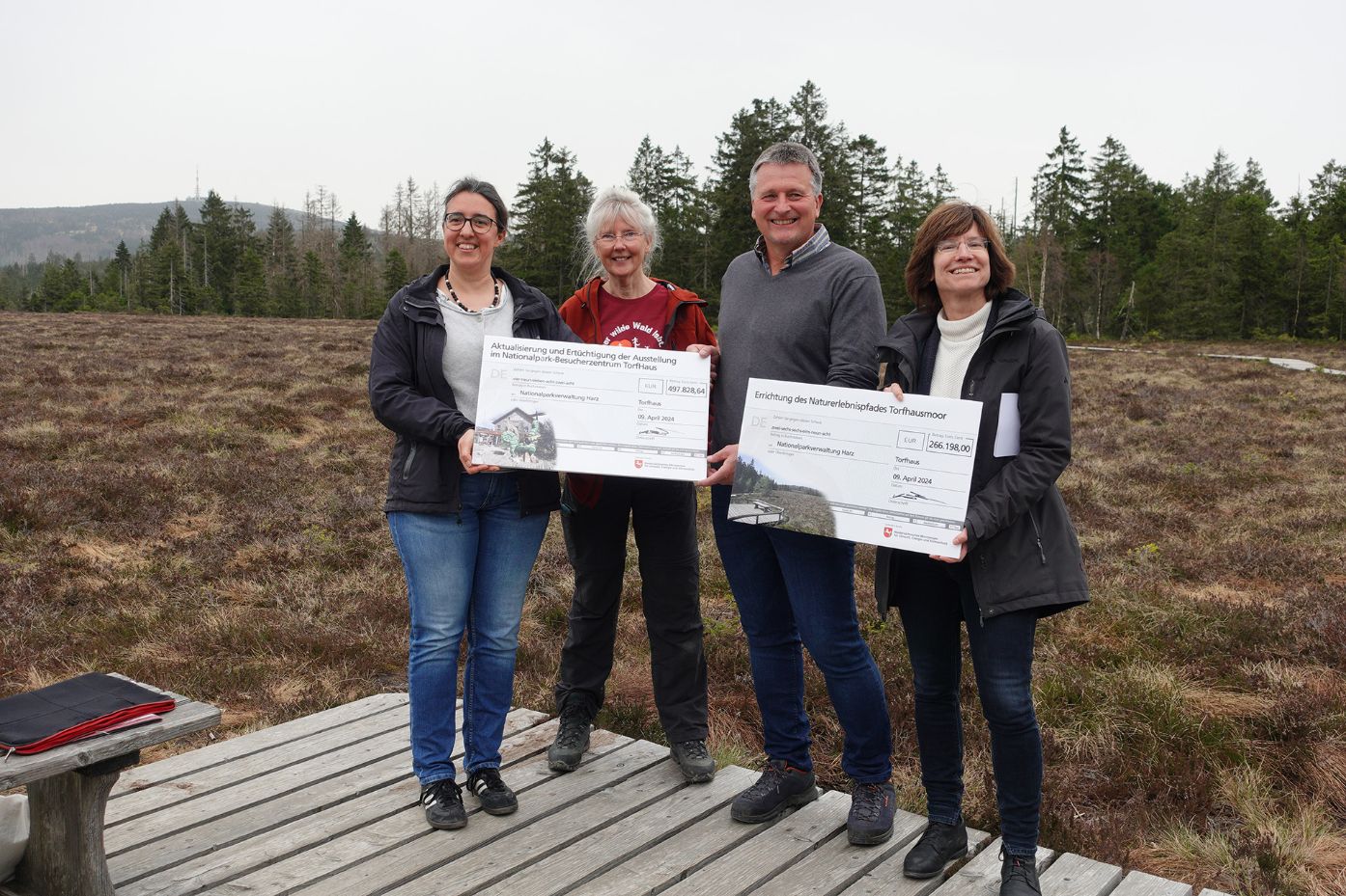 Torfhaus, 9. April 2024. Anka Dobslaw, Staatssekretärin im Niedersächsischen Ministerium für Umwelt, Energie und Klimaschutz, hat am heutigen Dienstag in Torfhaus die Förderbescheide für zwei Naturerlebnis-Projekte des Nationalparks Harz in Höhe von insgesamt rund 750.000 Euro an Nationalparkleiter Dr. Roland Pietsch und Susanne Gerstner, Vorsitzende des BUND-Landesverbands Niedersachsen e.V., dem Kooperationspartner des Nationalparks in Torfhaus, übergeben. Mit dem Geld wird nicht nur die Ausstellung im Nationalpark-Besucherzentrum TorfHaus (NBZ TorfHaus) erneuert, sondern als attraktive Ergänzung dazu ist ein Naturerlebnispfad entlang des Wanderweges rund um das Große Torfhausmoor geplant.