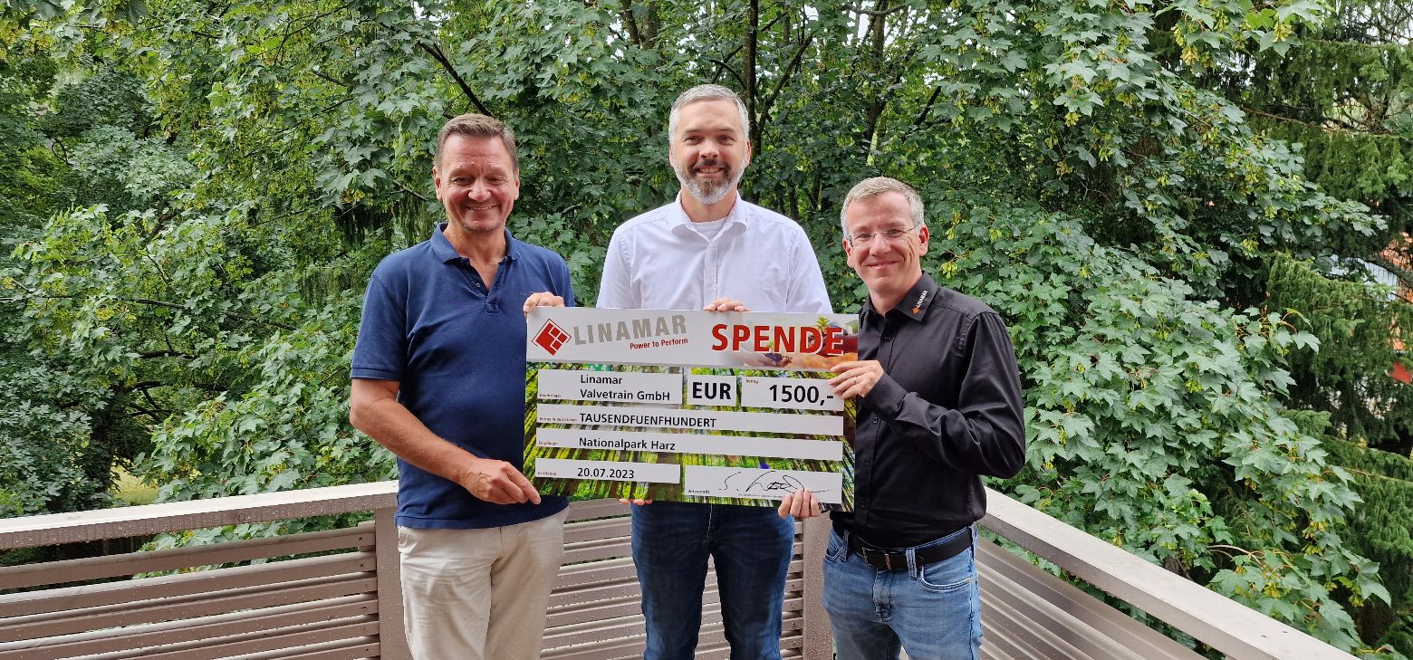 Um dieses Projekt zu gewährleisten, unterstützt die Linamar Valvetrain GmbH aus Thale den Nationalpark Harz mit einer Spende. Am 20. Juni überreichten Sascha Laurisch und Ronny Blockus von Linamar einen Scheck in Höhe von 1.500 Euro an Thomas Rader, Geschäftsführer der Initiative heiermann4future, für die Gesellschaft zur Förderung des Nationalparks Harz, vertreten durch Dr. Friedhart Knolle.