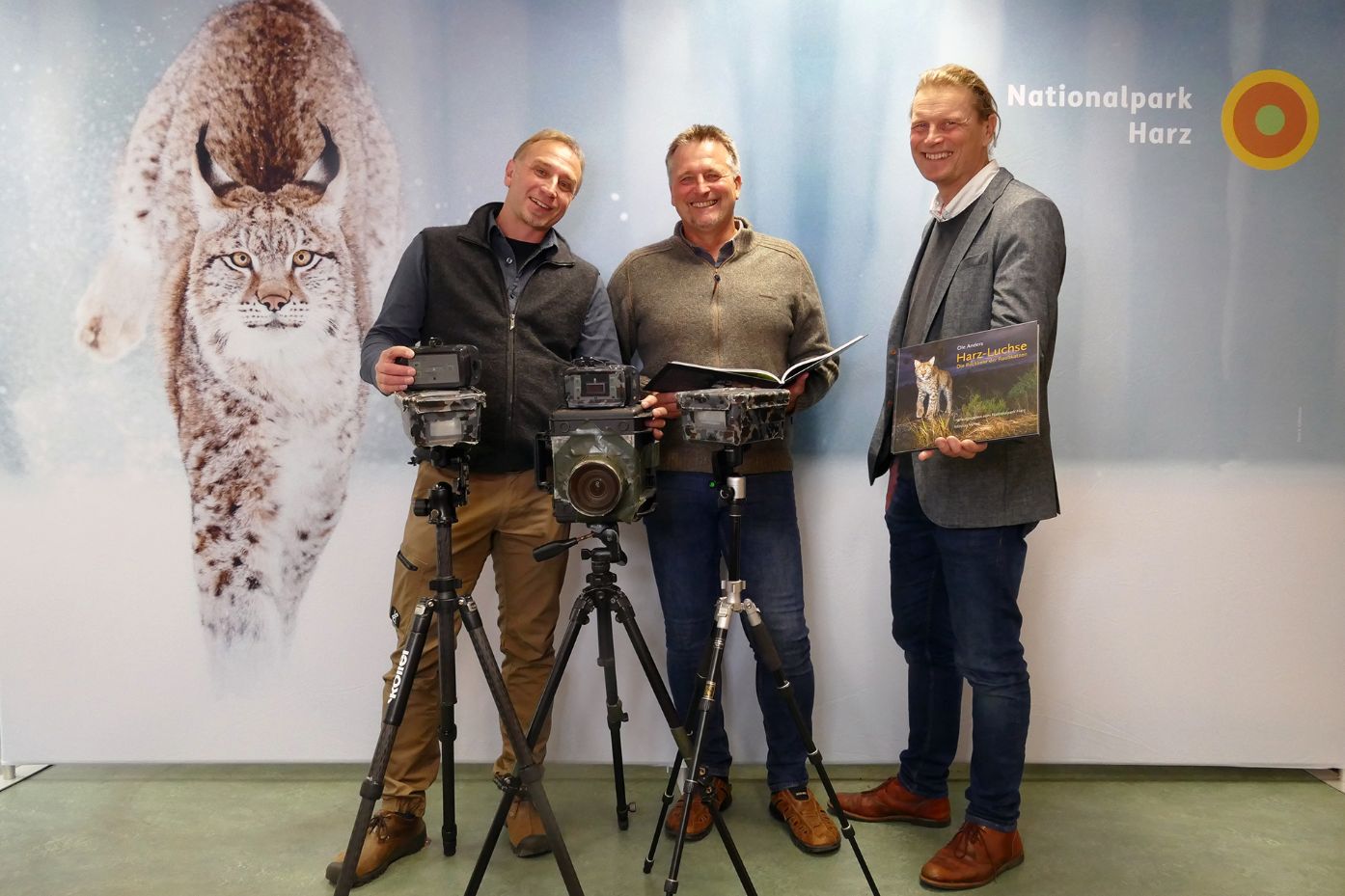 FOTO 1: Ole Anders, Koordinator des Luchsprojektes Harz, mit Nationalparkleiter Dr. Roland Pietsch und Verleger Jörg Mitzkat mit dem frisch erschienen Bildband „Harz-Luchse – Die Rückkehr der Raubkatzen“. Im Vordergrund eine der Fotofallen, mit denen Anders die eindrucksvollen Fotos der Luchse gemacht hat. Foto: Martin Baumgartner,