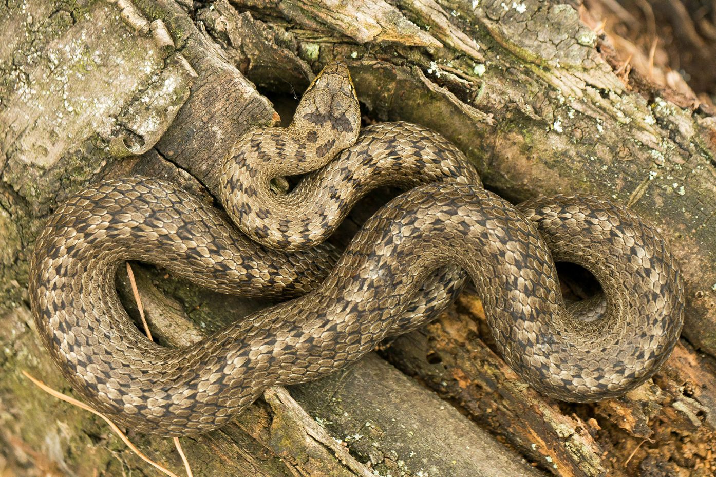 FOTO 2: Eine Schlingnatter (auch Glattnatter genannt), eine ungiftige Schlange, die aufgrund einer ähnlichen Grundfärbung oft mit der Kreuzotter verwechselt wird. Bei genauer Betrachtung kann sie durch die runden Pupillen und die in eine Fleckenreihe aufgelöste Rückenzeichnung gut von der Kreuzotter unterschieden werden. Im vergangenen Jahr gelang zufällig der Erstnachweis einer Schlingnatter im Nationalpark Harz. Foto: Axel Schonert
