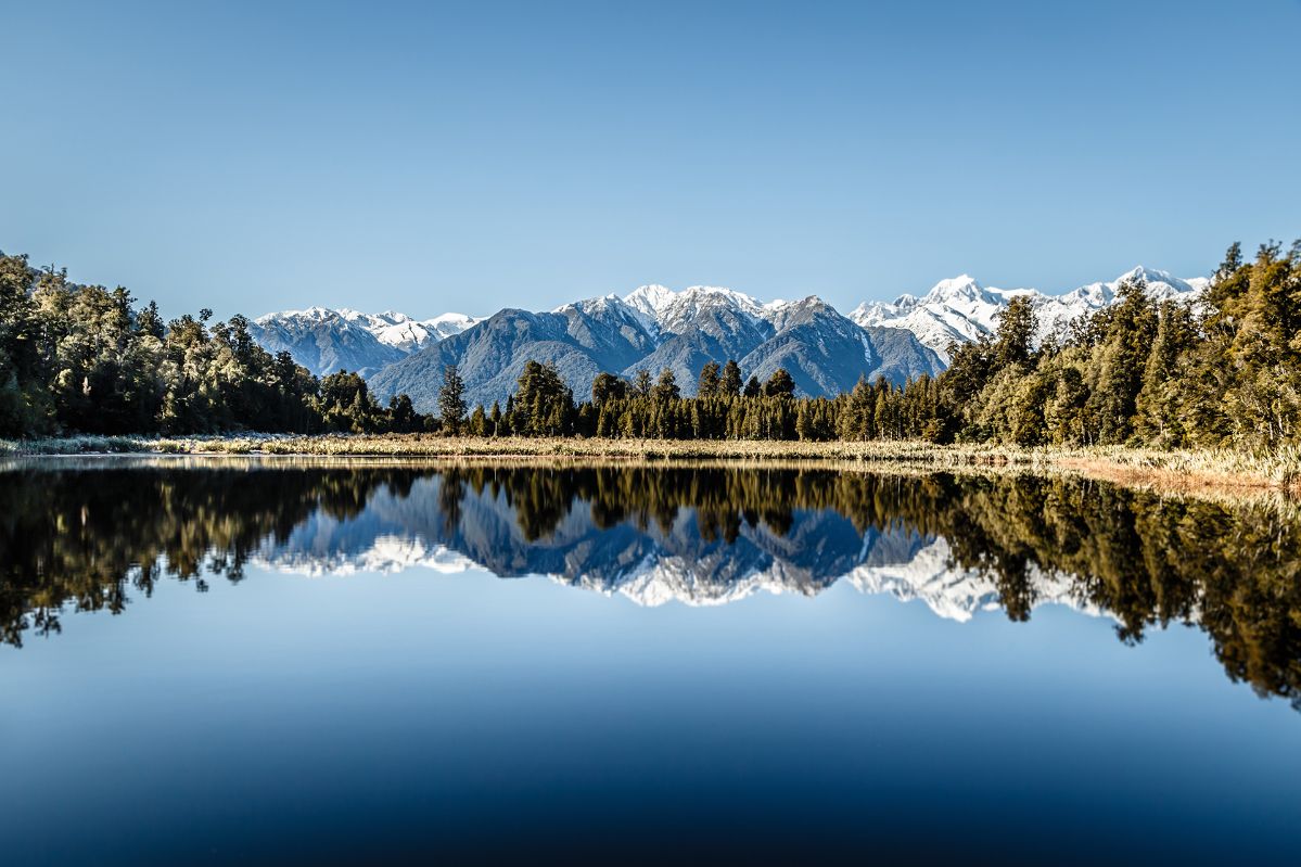 FOTO: Der Matheson-See, im Hintergrund die Berggipfel des Westland Tai Poutini National Park in Neuseeland.