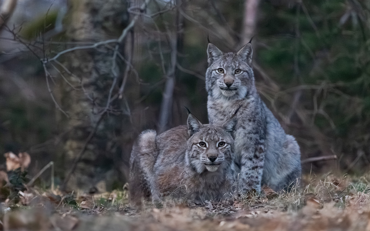FOTO: Diese Aufnahme einer Luchsin in Begleitung eines rund zehn Monate alten Jungtieres (hinten, aufrecht sitzend) gelang Naturfotograf Christoph Kaula bei einer Wanderung im Nationalpark Harz.