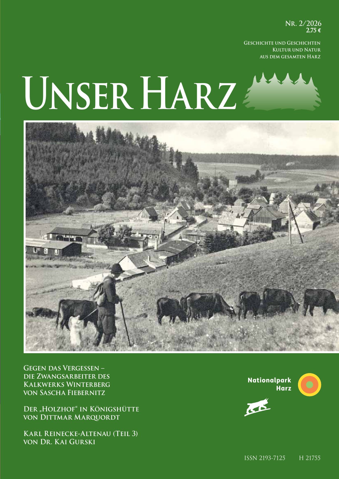 In der jüngsten Ausgabe von Unser Harz berichtet Sascha Fiebernitz über das Kalkwerk Winterberg: „Gegen das Vergessen“. Der Autor erinnert an das Schicksal zweier Opfer des Nationalsozialismus, Johann Grochalla und Boleslaw Schymoniak, und arbeitet zugleich die Geschichte des Steinbruchs Winterberg mit dem Kalkwerk Münchehof auf. Dittmar Marquordt blickt zurück auf den „Holzhof“ in Königshütte, einst eine Holzverarbeitungsstätte des Forstwirtschaftsbetriebs der Nationalen Volksarmee. Die Reihe über Karl Reinecke-Altenau, „Zwischen „Harzheimat“, „steinerner Fremde“ und den „Schwalben von Toledo“ von Dr. Kai Gurski, wird mit Teil 3 fortgesetzt, der Schwerpunkt liegt diesmal auf den „Trachten“. Friedhart Knolle würdigt Hans-Heinrich Hillegeist anlässlich seines 90. Geburtstags für seine Verdienste um die regionale Heimatforschung. „Wie es zu den heutigen Weidegrenzen und Weiderechten in Wolfshagen kam“, darum geht es in der Rubrik Rückblende, der Beitrag stammt aus Unser Harz im November 1959. Und das Nationalpark-Forum wirft einen Blick auf das Naturerlebnis-Programm 2026.